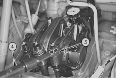 Use the 147-2060 Wrench (3) and use the 147-2059 Torque Wrench (4). Install the socket wrench and install the torque wrench on the nut of the rocker arm. Apply upward pressure to the front of the rocker assembly. Set the dial indicator to zero. Do not apply any pressure on the torque wrench.
