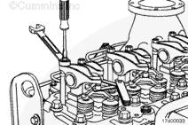 將康明斯發(fā)動(dòng)機(jī)塞尺插入跨接壓板和搖臂承座之間來測量間隙。如果間隙測量值超出技術(shù)規(guī)范,則松開鎖緊螺母,調(diào)整間隙至標(biāo)稱的技術(shù)規(guī)范。