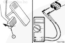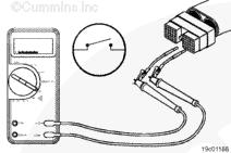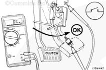 從康明斯離合器踏板位置開關接頭中拆下一個萬用表表筆,并使該表筆與底盤接地接觸。離合器踏板釋放時,萬用表必須顯示開路特征(100 千歐或更大)。如果電路閉合,更換離合器踏板位置開關。