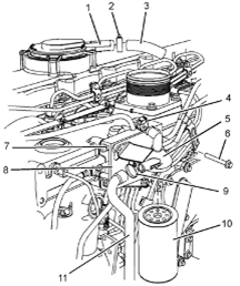 4松開卡箍(9),然后從Perkins1106A/C發動機曲軸箱呼吸器的濾清器座(5)上斷開軟管組件(11)。