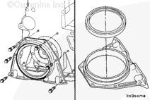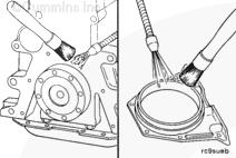 曲軸后油封安裝在殼體上,該殼體通過螺栓安裝在缸體后部。使用雙層 Teflon™ 密封件。曲軸密封面必須清潔并且在安裝油封時沒有機(jī)油。