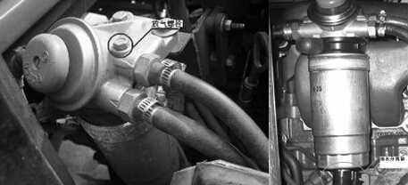 排放燃油系統中的空氣時,應該先旋轉燃油濾清器頂部的放氣螺栓(上圖所示),將其松開,按壓手油泵,直到從放氣孔中流出無空氣的燃油。緊固放氣螺塞,手油泵集成在濾清器上端。